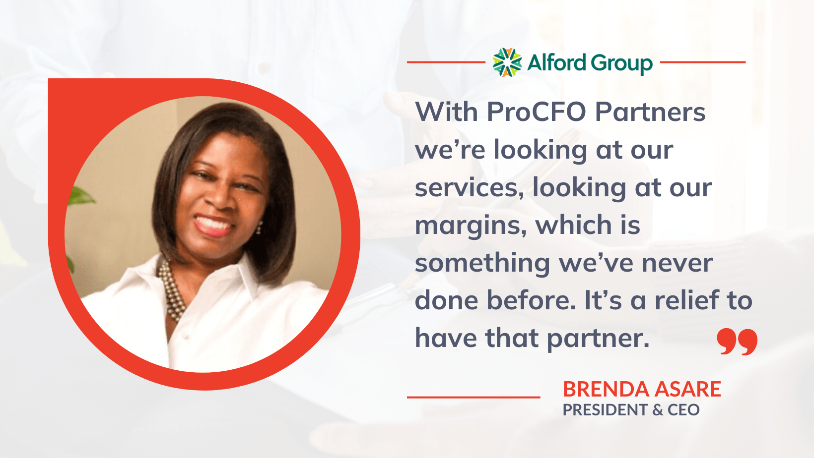 When leadership transition and financial uncertainty challenged The Alford Group’s growth, President & CEO Brenda Asare partnered with ProCFO Partners. Through strategic financial guidance and disciplined planning, the organization gained clearer visibility into its services and margins, strengthened decision-making, and built greater confidence in its path forward.